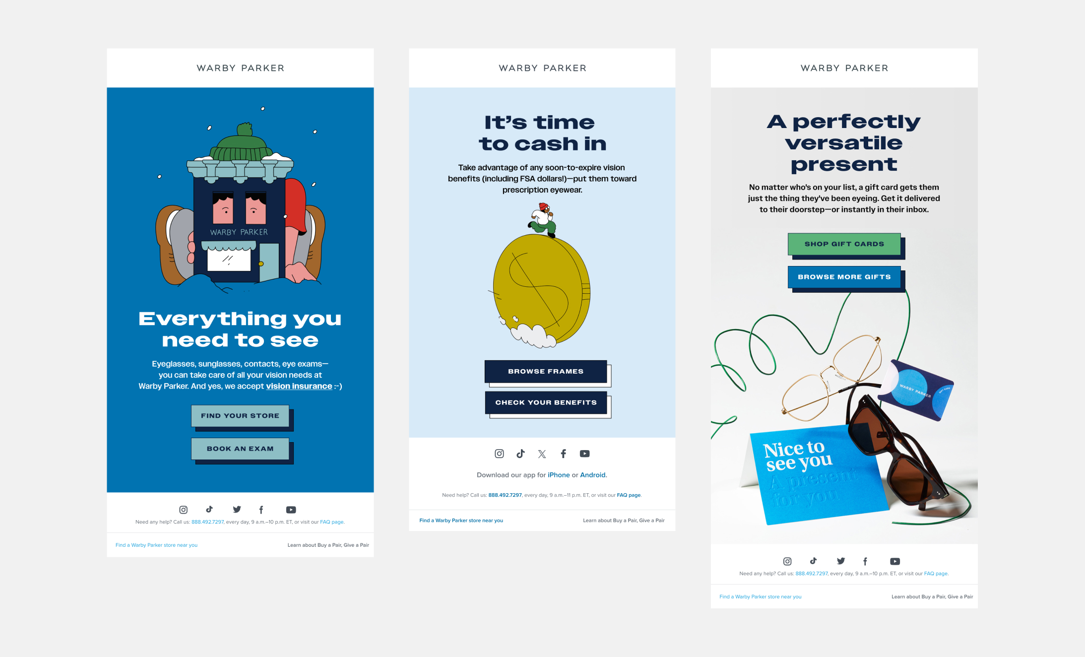 Various holiday emails featuring campaign photography and illustration. Holiday illustrations by Igor Bastidas.
